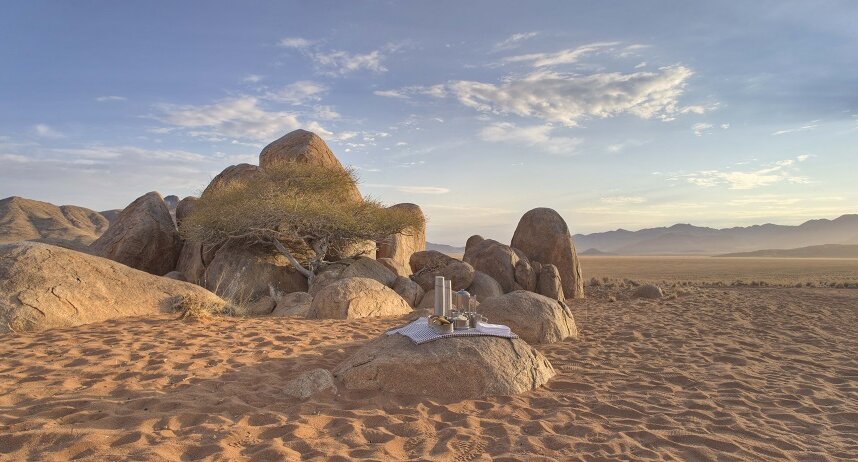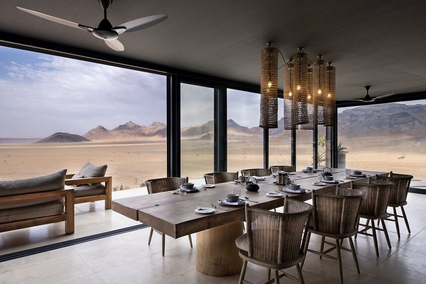 Umgeben von den Bergen und Sanddünen der Namib Wüste, ist die &Beyond Sossusvlei Desert Lodge eine Welt totaler Ruhe und romantischem Luxus. Seit 1999 gehört die Lodge bereits zur &Beyond Familie und wurde im Jahr 2019 komplett renoviert und im Oktober 2019 neu eröffnet. Die Unterkunft vereint nun Elemente aus Knochen, Schiefer und Stein die ein dramatisches, aber dennoch natürliches Aussehen schaffen, während raues Holz, zweifarbige Kronleuchter und Holzskulpturen an die zerklüfteten Berge erinnern. Aktive Gäste können Quad-Abenteuer in der Wüste erleben und Wanderungen und Spaziergänge in der Umgebung unternehmen. Die Ausflüge zu den atemberaubenden Dünen des Sossusvlei und zum Sesriem Canyon finden in klimatisierten Fahrzeugen statt. Für Abkühlung sorgt der Pool mit Blick in die Weite der Namib und für weitere Entspannung werden Massagen in der eigenen Suite angeboten. Ein Astronom bringt Ihnen die Geheimnisse der Sterne im hochmodernen Observatorium näher. Die Unterkunft lädt Sie dazu ein, sich wieder mit der Natur und sich selbst zu verbinden. Ein Fitnessstudio und ein Signature Shop machen das Angebot der Lodge komplett.