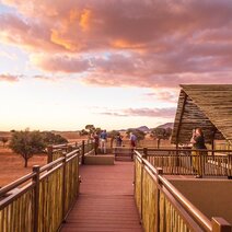 Die Sossusvlei Lodge liegt vor den Toren des Namib Naukluft Nationalparks und bietet direkten Zugang zu der berühmten Pfanne des Sossusvlei, den hoch emporragenden roten Sanddünen, den bemerkenswerten Tiefen des Sesriem Canyons und den verbrannten schwarzen Bäumen des Dead Vlei. Der Hauptbereich verfügt über Rezeption, Bar sowie Souvenirladen und Swimmingpool. Das Restaurant bietet exzellente Küche in Form eines Buffets; je nach Wetterlage ist es möglich auch auf der weitläufigen Terrasse mit Blick auf eine kleine Wasserstelle zu essen.