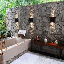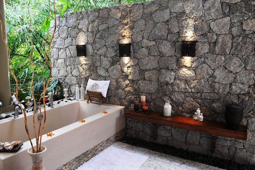 Die 20 Garden Villen (ca. 60 m²) verfügen über ein Schlaf- und Badezimmer, Sitzecke und einen Außenbereich mit Terrasse. Die acht Garden Suite Resi dences (ca. 100 m²) haben Platz für zwei bis vier Personen und verfügen über einen Schlaf- und einen Wohnraum, der in ein zweites Schlafzimmer umgewandelt werden kann, ein luxuriöses Bad mit Außen dusche und eine Terrasse. Holz und lokale Materialien dominieren die Ausstattung der 31 Villen de Charme (ca. 70 m²), zu deren Highlights das große Außenbad mit Badewanne, Dusche sowie die Terrasse gehören. Aufwendiger ausgestattet sind die drei Villen de Charme Élégance (ca. 100 m²) in besonders exponierter Lage mit Whirlpool.