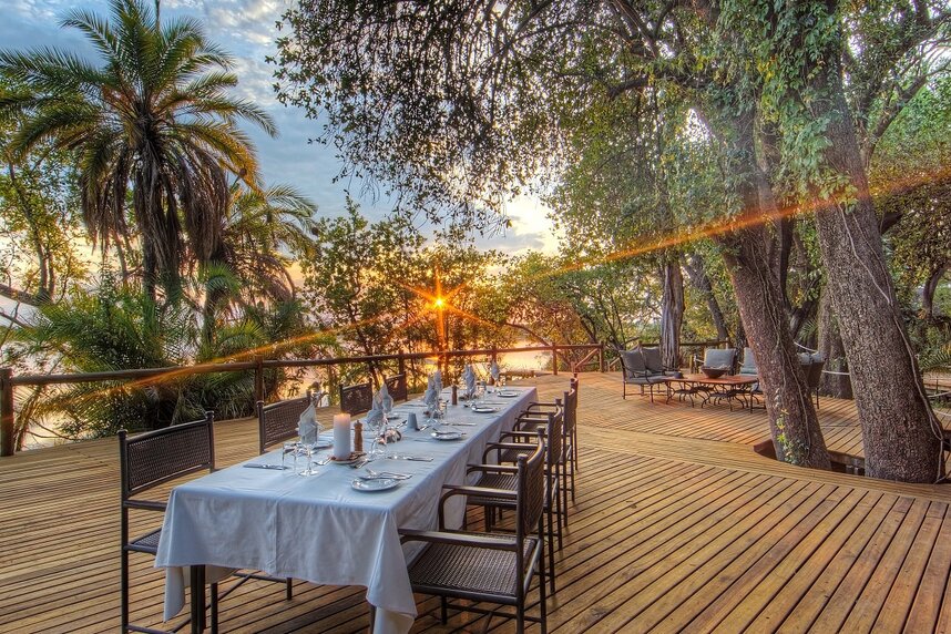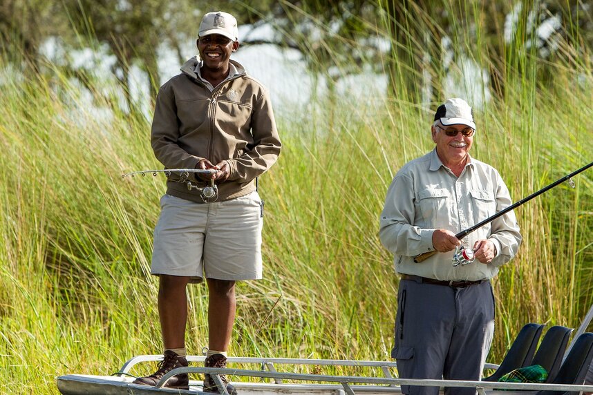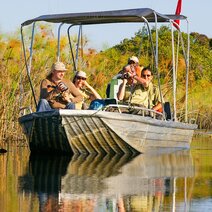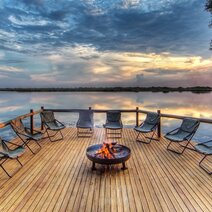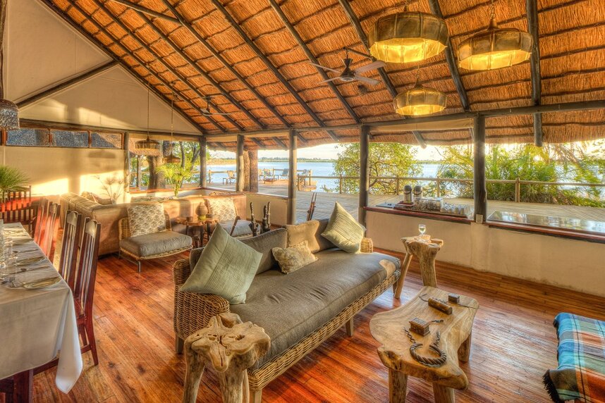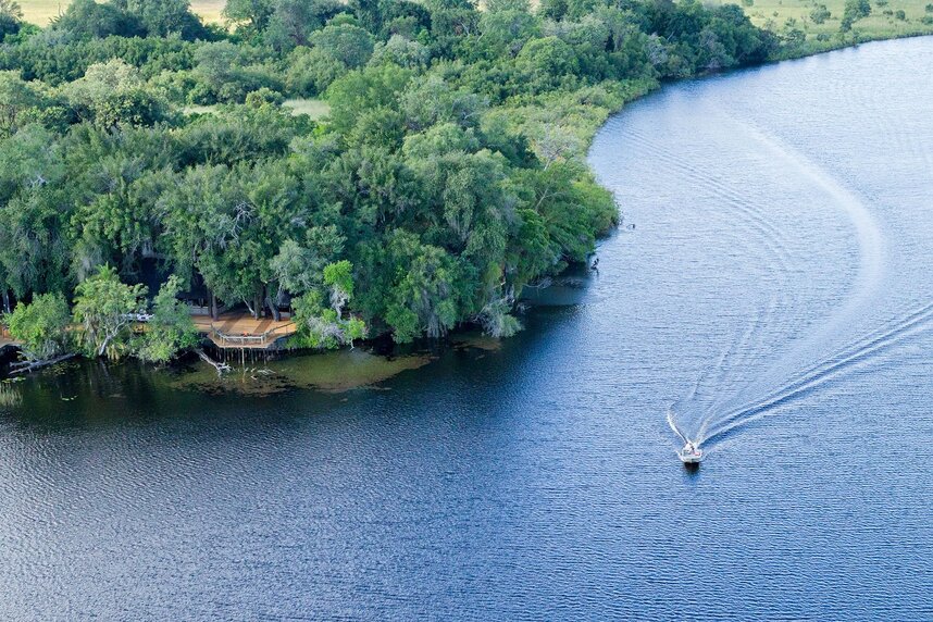 Ganzjährig vom Wasser umgeben und mit einer großen Lagune direkt vor der Lodge bietet Xugana hervorragende Safariaktivitäten. Mit dem Motorboot oder Kanu die Lagunen erkunden, sich an schnaubende Flusspferde heranpirschen, zur Beobachtung der bunten Vogelwelt lautlos durch das Schilf gleiten oder die Ruhe genießen, die nur durch den Schrei der Seeadler unterbrochen wird - das sind einmalige Erlebnisse. Das reetgedeckte Haupthaus mit Lounge, Bar und Restaurant steht unter alten Ebenholz- und Mangostanbäumen. Für Abkühlung sorgt der im Herzen der Insel liegende Pool. Ein Drink zum Sonnenuntergang auf dem hölzernen Deck rundet den erlebnisreichen Tag im Busch ab.