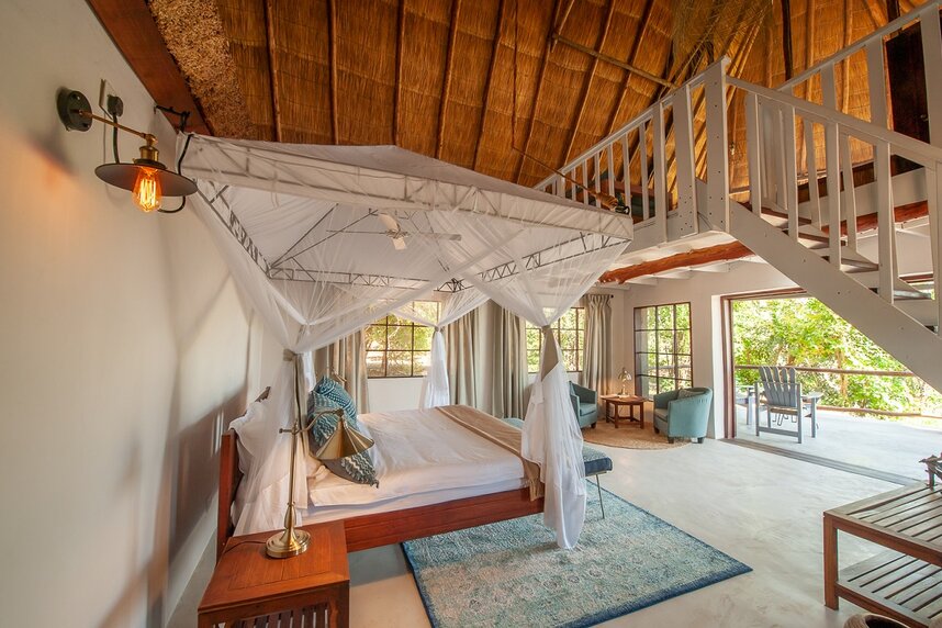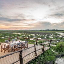 Alle zehn reetgedeckte Chalets sind auf erhöhten Plattformen errichtet und verfügen über en-Suite Bad und Aussichtsdeck mit herrlichem Rundblick auf die Flussauen.