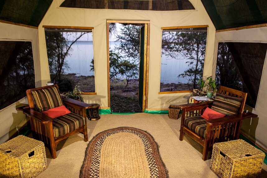 Zum Camp gehören sechs komfortable Safarizelte mit Steinmauern und reetgedecktem Stein-Bad inklusive Dusche. Sie liegen alle direkt am Seeufer, den Blick können Sie von Ihrer eigenen Terrasse genießen. Noch mehr Komfort bieten zwei Honeymoon-Suiten mit Pool.