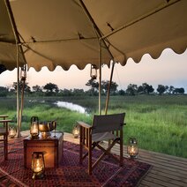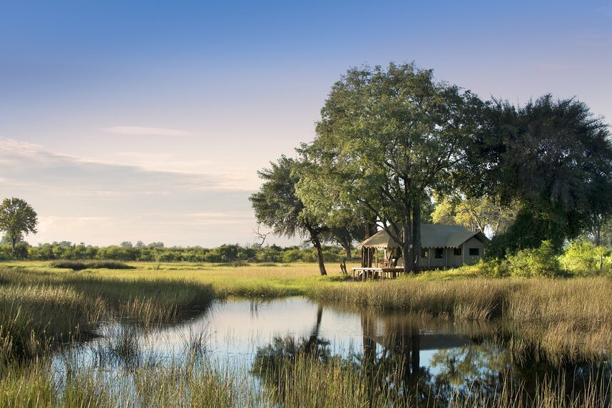 Die fünf Zelte liegen auf erhöhten Plattformen und sind durch Holzstege miteinander verbunden. Von Ihrer privaten Terrasse aus genießen Sie einen einmaligen Ausblick über die weiten Ebenen des Deltas.