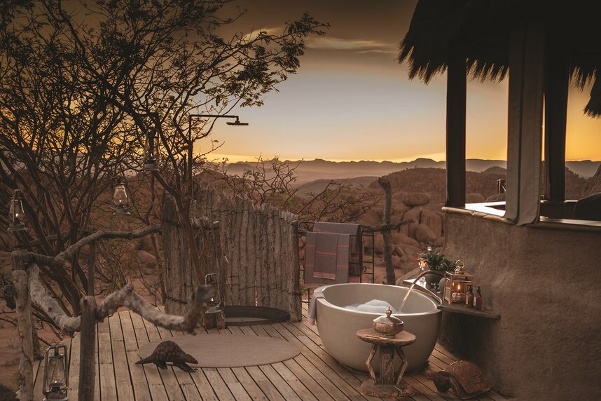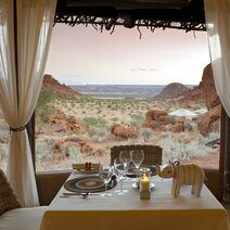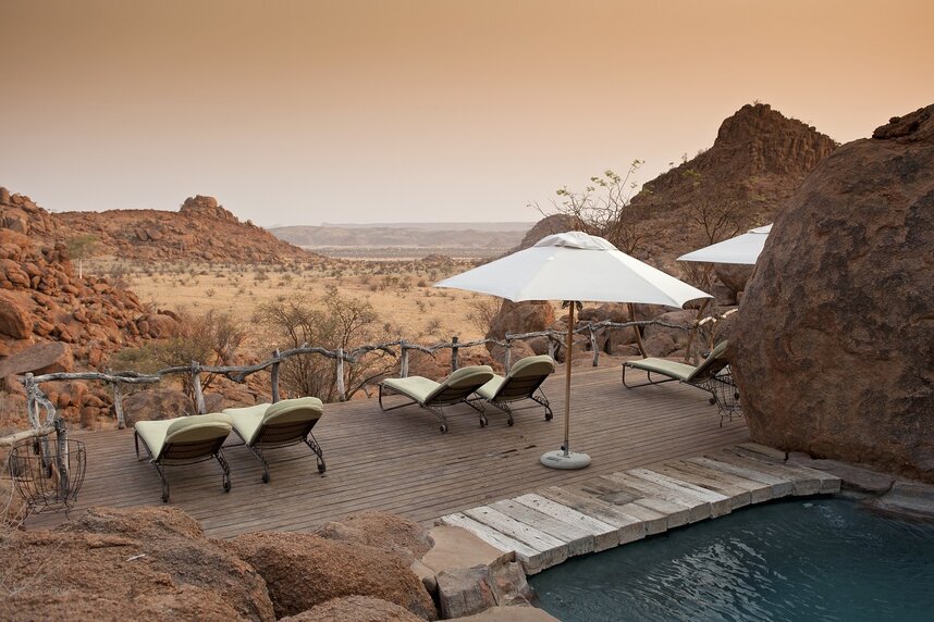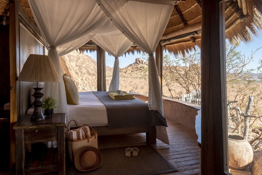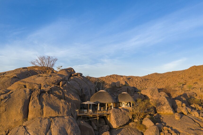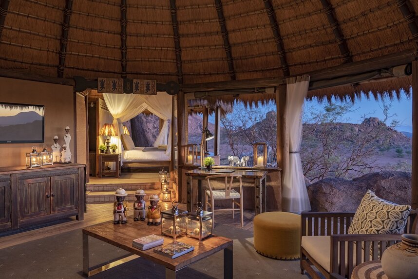Die 15 Suiten sind auf erhöhten Plattformen erbaut und in die natürliche Umgebung eingegliedert, sodass man sie aus größerer Entfernung nicht von den Findlingen der Bergkette unterscheiden kann. Die meisten bieten einen unendlich weiten Blick in die traumhaft schöne Landschaft des Damaralands. Die 12 Standard View, View und Superior View Zimmer unterscheiden sich nur durch die Aussicht. Alle Zimmer sind klimatisiert und im ostafrikanischen Stil dekoriert und verfügen über Bad mit Dusche. Die Mini Suite und die Mountsuite (begrenztes WLAN) warten beide mit einem Plunge Pool, Lounge mit TV und Musikanlage, Minibar, Outdoor Dusche, Private Dining und Wäscheservice ab 2 Nächten Aufenthalt auf. Ebenso steht Ihnen in den Suiten ein eigener Butler-Service zur Verfügung.