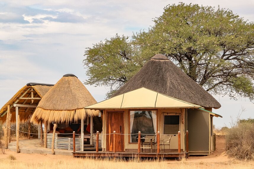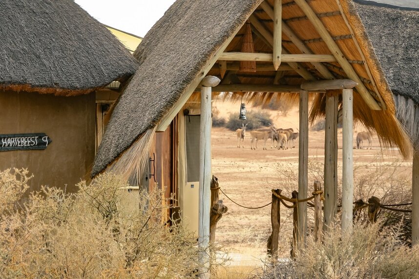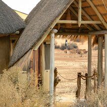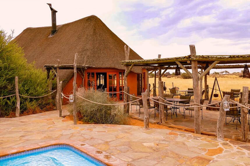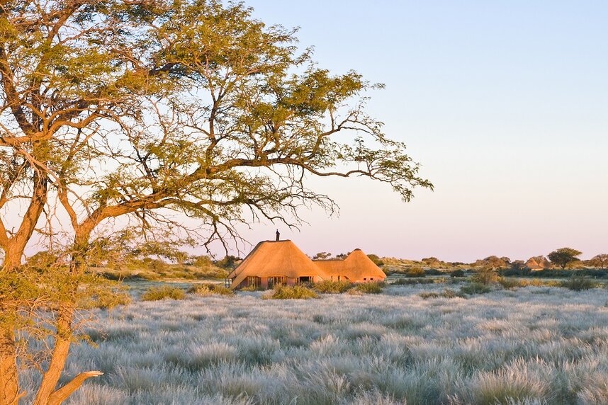 Die mit viel Liebe zum Detail erbaute Kalahari Red Dunes Lodge befindet sich in der beeindruckenden, von ziegelroten Sanddünen und Kameldornbäumen geprägten Kalahari-Landschaft. Das Haupthaus der Lodge wurde auf einer natürlichen Insel im Trockensee (Vlei) im afrikanischen Stil errichtet. Es ist nur über einen 120 Meter langen Holzsteg zu erreichen und besitzt ein traditionelles afrikanisches Grasdach. Der Hauptbereich verfügt über ein Restaurant, eine Bar und eine Sundowner-Terrasse mit Swimmingpool mit Liegen und Schattenbereich. In der Kalahari Lounge können Sie eine erlesene Whiskey Auswahl genießen. Die neue Massage Lounge ist eine wunderbare Ergänzung der Anlage.