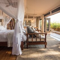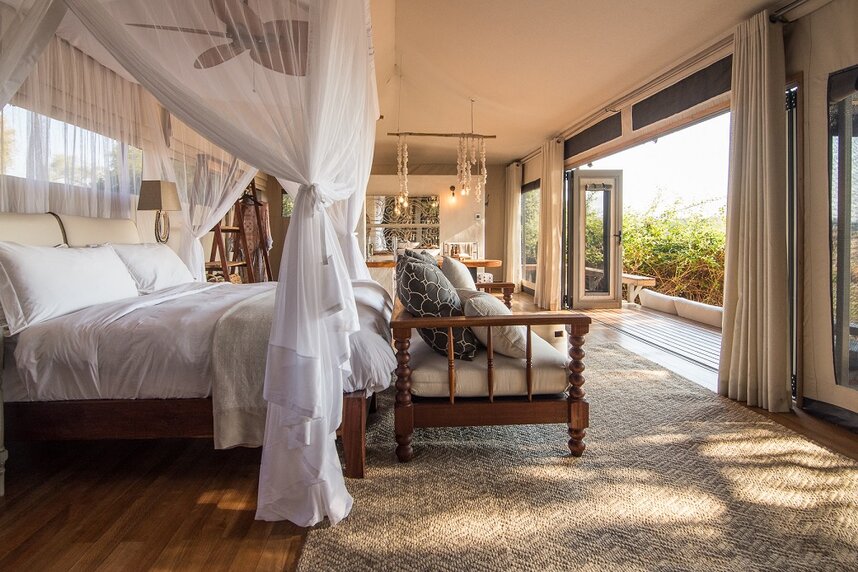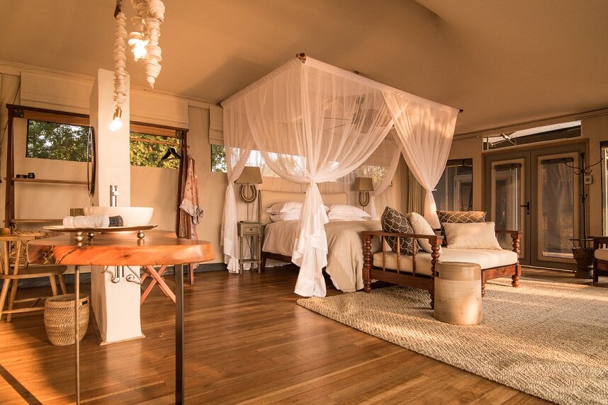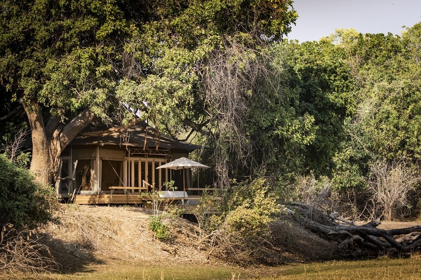 Das luxuriöse Camp verfügt über 8 Zelt-Suiten, 1 Honeymoon Suite und 1 Präsidentensuite. Die strohgedeckten Zelt-Suiten, welche auf Teakholzplattformen gebaut sind, verfügen über eine exklusive und erstklassige Innenarchitektur. Ausgestattet sind sie mit einem eigenen Bad, einem Ankleidezimmer, Außendusche, Kolonialbad, Klimaanlage und Deckenventilator. Auf der privaten Terrasse kann man die herrlichen Sonnenuntergänge und die Tierwelt im Zambezi Fluss Tal genießen. Die Honeymoon Suite liegt etwas abseits der nächsten Zelt-Suite und ist mit Ausnahme eines Außen-Whirlpools gleich ausgestattet wie die Zelt-Suite. Am östlichen Rande des Camps liegt die sehr luxuriöse Präsidentensuite. Sie verfügt zusätzlich über eine Whirlpool-Badewanne, einen privaten Swimmingpool, privaten Speise- und Barbereich, Lounge, Kamin, Sonnendeck und Außengärten. Alle Unterkünfte sind durch hölzerne Laufwege mit dem Hauptgebäude verbunden.