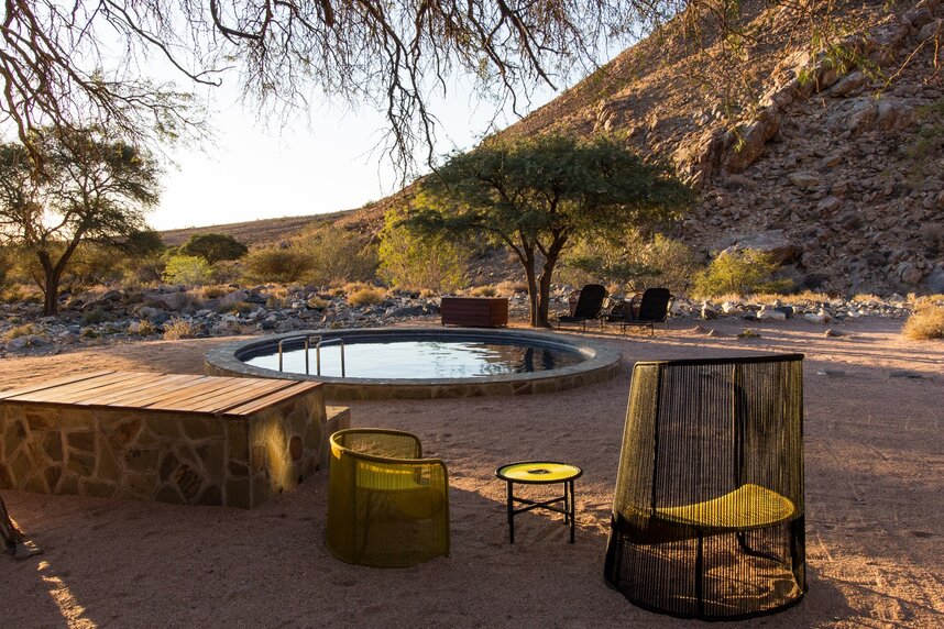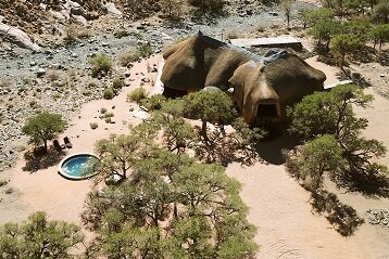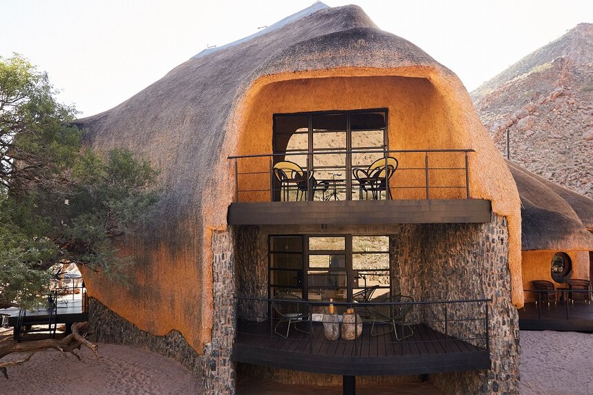 Das 2019 neu gebaute The Nest @ Sossus ist eine komplett aus Naturmaterial gebaute Privatvilla mit großzügigen und offenen Wohnbereichen, die ineinander übergehen und ein angenehmes Gefühl von Geborgenheit vermitteln. Der Architekt Porky Hefer verlieh ihr mit Rundungen und minimalistischem Design einen vollkommen eigenen Charakter. Die modern ausgestattete Villa verfügt über einen Pool und kokonartige Innenräume, darunter eine Bibliothek, eine offene Küche und vier en-suite Schlafzimmer mit runden Bullaugen-ähnlichen Fenstern, die zum Nesterscheinungsbild beitragen und einen spektakulären Blick in die Landschaft bieten. Inspiriert vom Nestbau der Webervögel, bietet es ein exklusives und luxuriöses Wohnerlebnis in dieser legendären, aber einsamen Gegend Namibias. Viele Wildtiere wie Leoparden, Geparden, Giraffen und Fleckenhyänen kommen an das nahe gelegene Wasserloch in dem privaten Namib Tsaris Naturschutzgebiet.