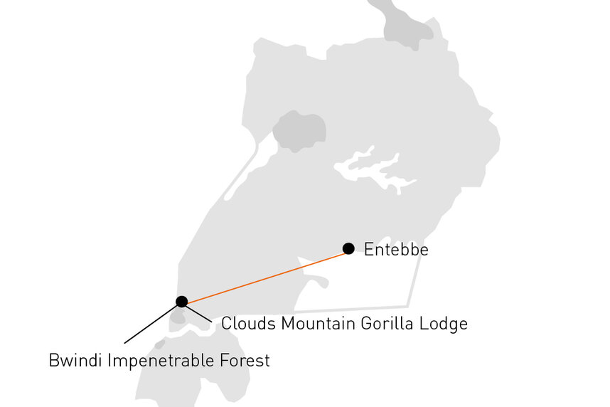 Frühmorgens fliegen Sie von Entebbe nach Kisoro am südlichen Teil des Nationalparks. Die anschließende ca. 2-stündige Fahrt zur Lodge führt durch tropische Landschaft, die geprägt ist von kleinen Dörfern, Vulkanen und Wasserfällen.