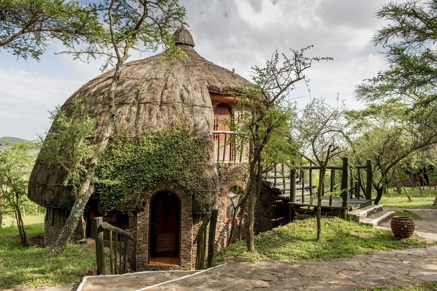 Auch die Zimmer sind typisch afrikanisch: zweistöckige, reetgedeckte Rondavels (Rundbauten), in denen 66 Zimmer untergebracht sind. Jedes Zimmer hat einen Balkon und eine Terrasse mit herrlichem Ausblick auf die weite Landschaft der umgebenden Serengeti.
