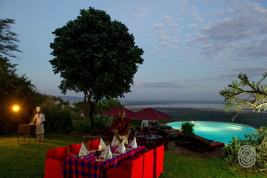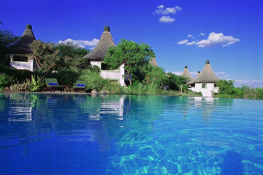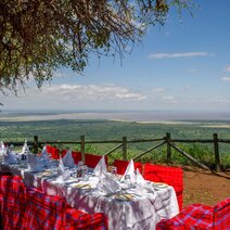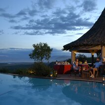 Hoch oben auf dem Plateau des Rift Valleys, im Manyara Nationalpark, steht die Lodge mit unvergleichlichen Blicken auf den schimmernden Manyara See. Jeder Punkt der Anlage ist auf diesen spektakulären Ausblick ausgerichtet: Der Infinity Pool über dem großen Grabenbruch, die Bars, das Restaurant und die große Veranda. Der Stil ist von der traditionellen Bauweise der Massai inspiriert.