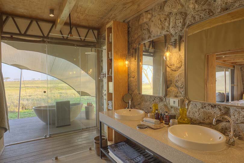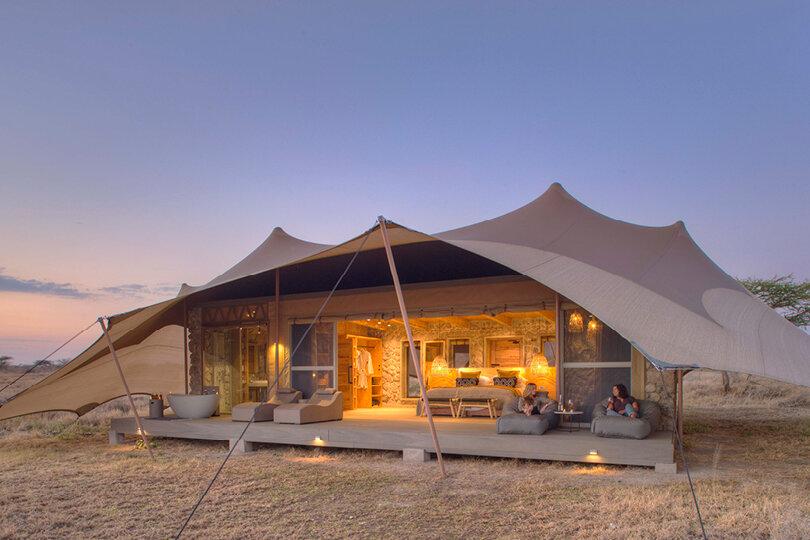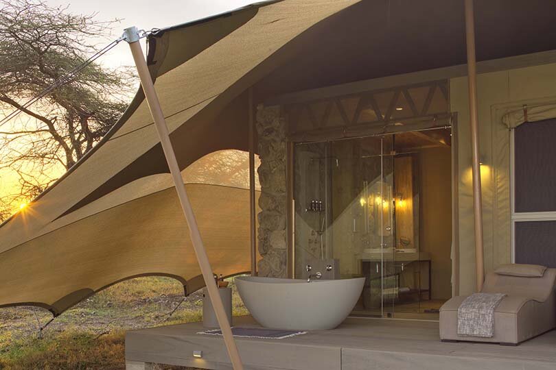Das Camp wurde aus natürlichen Materialien wie Kalkstein errichtet und fügt sich harmonisch in die Umgebung ein. Jedes der 10 Gästezelte verfügt über eine große private Veranda und einem en-suite Badezimmer. Neu ab Juli 2023 sind die beiden separat gelegene Retreats: Mit zwei Schlafzimmern mit jeweils eigenem Badezimmer und einem gemeinsamen Wohnbereich eignet es sich perfekt für Familien und bietet ein erhöhtes Maß an Luxus, Stil und Privatsphäre, kombiniert mit einem ein völlig flexiblen Serengeti-Safari-Erlebnis mit eigenem Safari-Guide und Fahrzeug, Koch und Gastgeber.
