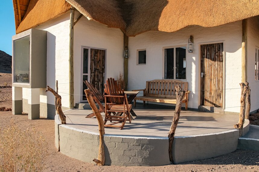 Die zwölf reetgedeckten Zeltsuiten wurden auf erhöhten Holzplattformen erbaut. Sie sind gemütlich eingerichtet und verfügen alle über eine private Terrasse, die in warmen Nächten dazu einlädt, direkt unter dem weiten Sternenhimmel Namibias zu übernachten. Die Front des Suiten ist komplett mit Glasfenstern und einer großen Glastür versehen, sodass Sie vom Inneren einen atemberaubenden Blick auf die Landschaft genießen können. Alle Wohneinheiten verfügen zudem über ein gemauertes en-Suite Badezimmer mit Dusche und Doppelwaschbecken, sowie über Moskitonetze, eine Klimaanlage, eine Minibar, eine Tee- und Kaffeestation und einen Safe. Die Superior Suite ist zusätzlich mit einem privaten Plunge Pool und einer größeren Wohneinheit ausgestattet.