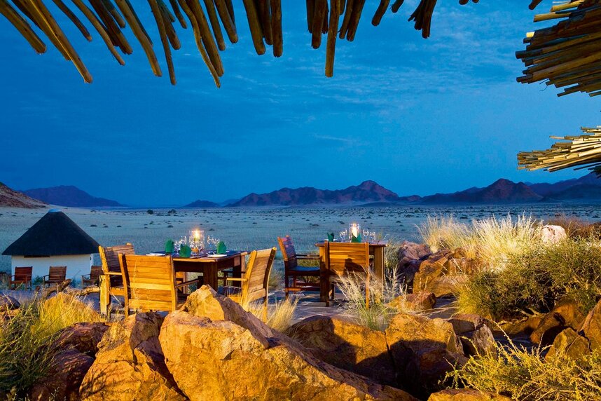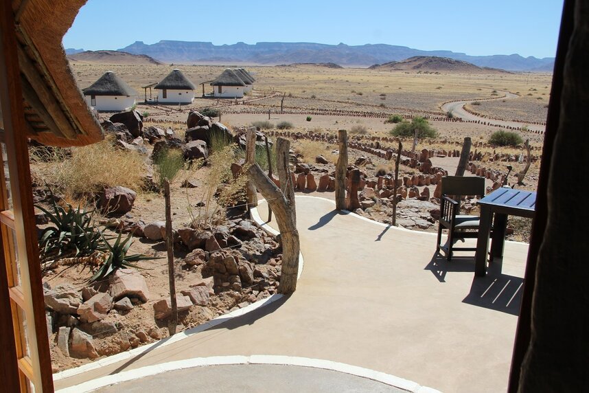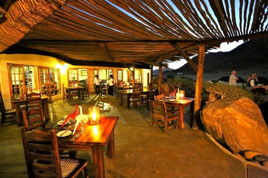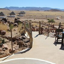 Die Namib Outpost Lodge liegt in einem 7000 ha großen privaten Naturschutzgebiet, ca. 30 km vom Eingang des Namib Naukluft Parks entfernt. Das hochwertige Outpost liegt am Fuße eines Berges und bietet Gästen einen atemberaubenden Blick über weite Grasebenen und die Vorläufer der Namib, für deren Besuch die Lodge ein sehr guter Ausgangspunkt ist. Das Haupthaus der Unterkunft bietet neben einem fantastischen Rundum-Blick auf die umgebenden Landschaft einen Swimmingpool, Liege- und Sitzmöglichkeiten und ein gemütliches Wohnzimmer mit Kamin für kalte und Klimatisierung für warme Tage. Nach einem heißen Tag in der Wüste bietet sich ein erfrischendes Bad in einem der beiden Pools an. Anschließend können Sie auf gemütlichen Liegen und in der schattigen Poollounge herrlich entspannen. Die neue Massage Lounge ist eine wunderbare Ergänzung der Lodge. Das Haupthaus ist außerdem mit einem Safe, kostenlosem Wi-Fi, Mobilfunk-Empfang und überdachten Parkplätzen ausgestattet. Das Restaurant bietet Sitzgelegenheit innen und außen Außerdem erwartet Sie eine Aussichts- und Sundowner-Terrasse mit Erfrischungsangebot oberhalb der Lodge auf dem Berg. Zahlreiche Aktivitäten wie z.B. Pferdesafaris, Ausflüge zu den Dünen des Sossusvlei und Wandertouren können unternommen werden.