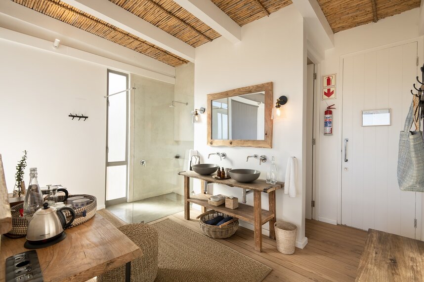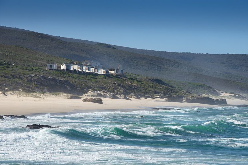 Die aus natürlichen Materialien erbaute Lodge fügt sich gut in die Landschaft ein. Sie bietet nur sieben komfortabel eingerichtete Zimmer, darunter 1 Familienzimmer, direkt an einem 6 km langen Privatstrand mit atemberaubenden Felsenpools. Jedes Zimmer verfügt über ein separates Bad mit Dusche, raumhohe Glasfenster mit Blick auf den Indischen Ozean, einen Holzofen für die kalten Wintermonate und eine kleine Veranda.