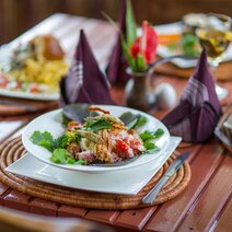 Das Heaven Restaurant & Boutique Hotel bietet seinen Gästen 22 Zimmer, die sich auf drei separate Grundstücke entlang der Straße verteilen. Alle Zimmer verfügen über eine Klimaanlage (mit Ausnahme des Economy-Zimmers der Villa Queen), Fernseher, Minikühlschrank, einen Safe und teilweise über eine eigene Terrasse.