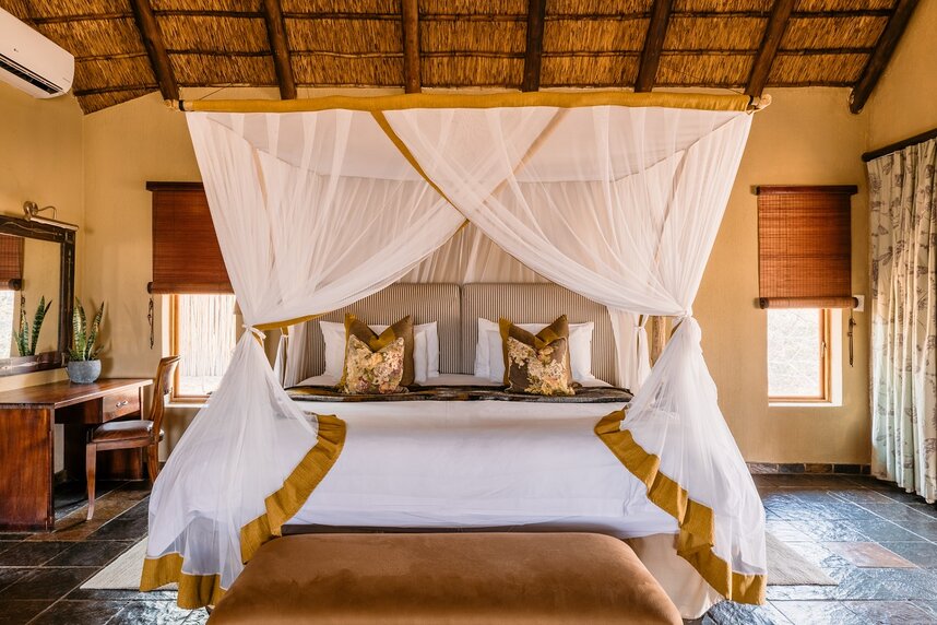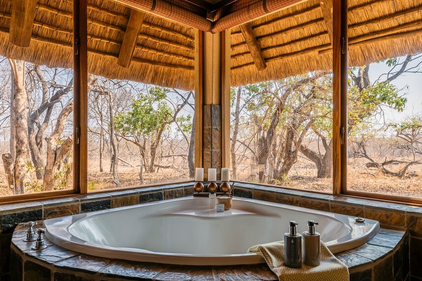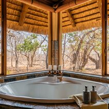 Die Badezimmer sind mit Doppelwaschbecken, einer Dusche und Eckbadewanne mit Blick in den Busch, eingerichtet. Eine extra Außendusche bietet Erfrischung zu den lyrischen Klängen des Bushveld-Chores.