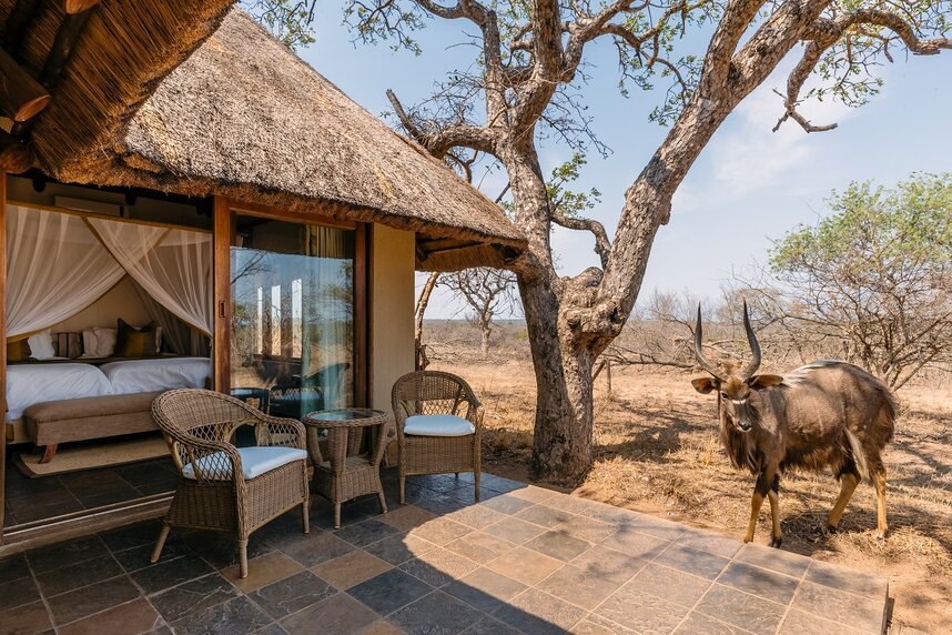 Flug von Johannesburg nach Hoedspruit, von dort eine ca. 45-minütige Autofahrt zur Lodge. Die Autoanreise ab Johannesburg dauert ca. 5,5 Stunden.