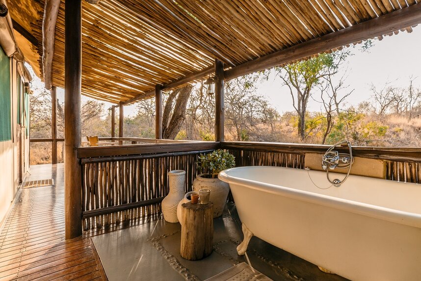 Jedes, der acht Zelte steht auf einem erhöhten Holzdeck und bietet Ausblick auf die Ebene. Die Zeltwände lassen den Ruf der Natur und des Busches eindringen und ermöglichen Ihnen ein intensives Safari Erlebnis. Ein Scheinwerferlicht ermöglicht rund um die Uhr den Blick in die Natur und sogar das Badezimmer ist zu einem Deck mit einer großen Badewanne hin geöffnet. Sollten Sie genug afrikanische Sonne getankt haben, können Sie die Abendbeobachtungen klimatisiert durch verglaste Türen fortsetzen. Große King-Size-Betten empfangen Sie nach den Abenteuern des Tages.