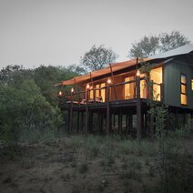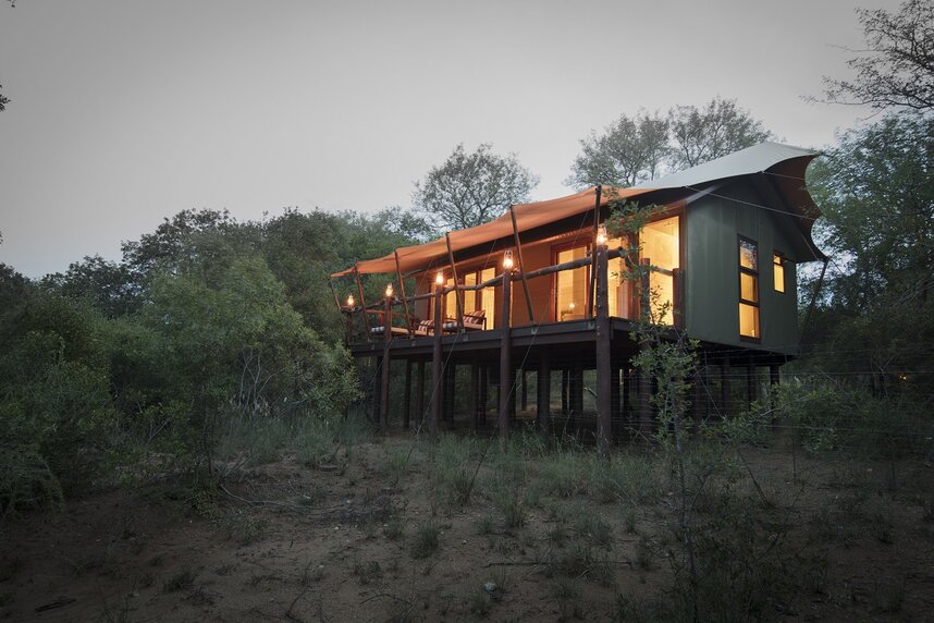 Die zehn, afrikanisch dekorierten, Zeltsuiten befinden sich auf erhöhten Plattformen und sind von Bäumen umgeben. Die gemütlichen Suiten sind durch erhöhte Holzstege miteinander verbunden und bieten eine private Veranda mit Blick auf den saisonalen Fluss und in den Busch.