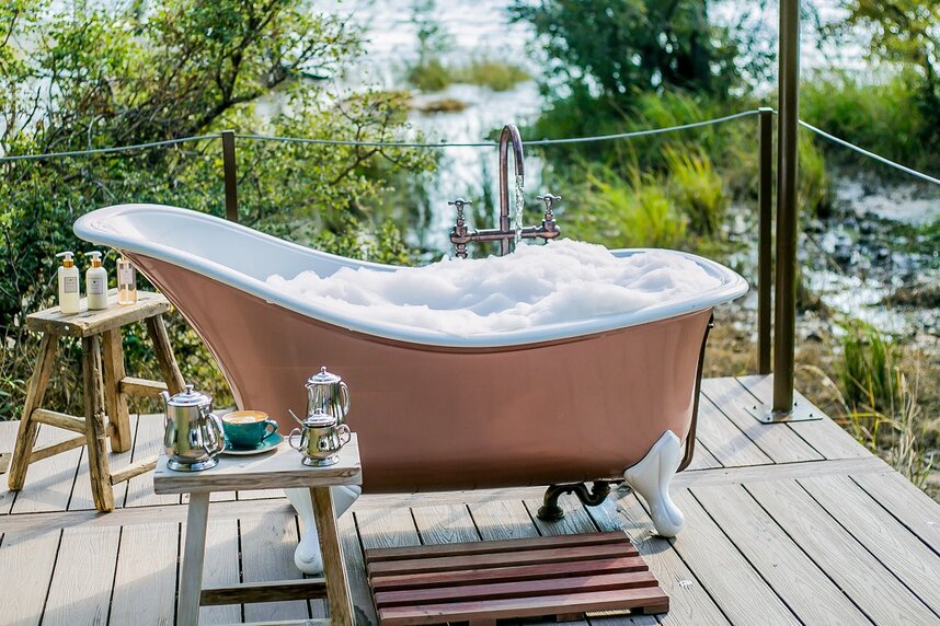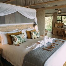 Die luxuriös und großzügig gestalteten Suiten sind mit stilvollen Möbeln ausgestattet. Jedes der insgesamt 14 Zelte verfügt über eine Innen-sowie Außendusche und einen kleinen privaten Pool.