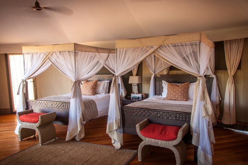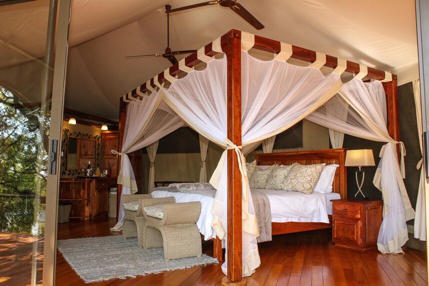 Das Zambezi Sands River Camp umfasst 10 sehr komfortable und geräumige Zelte mit je einer Größe von 74m², die durch 56m² große private Terrassen ergänzt werden. Jedes der Zelte verfügt über eine Lounge, eine Minibar, eine Kaffee- und Teestation, ein en-suite Badezimmer, eine Außendusche sowie über einen kleinen privaten Pool.
