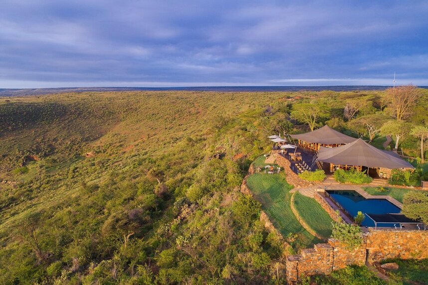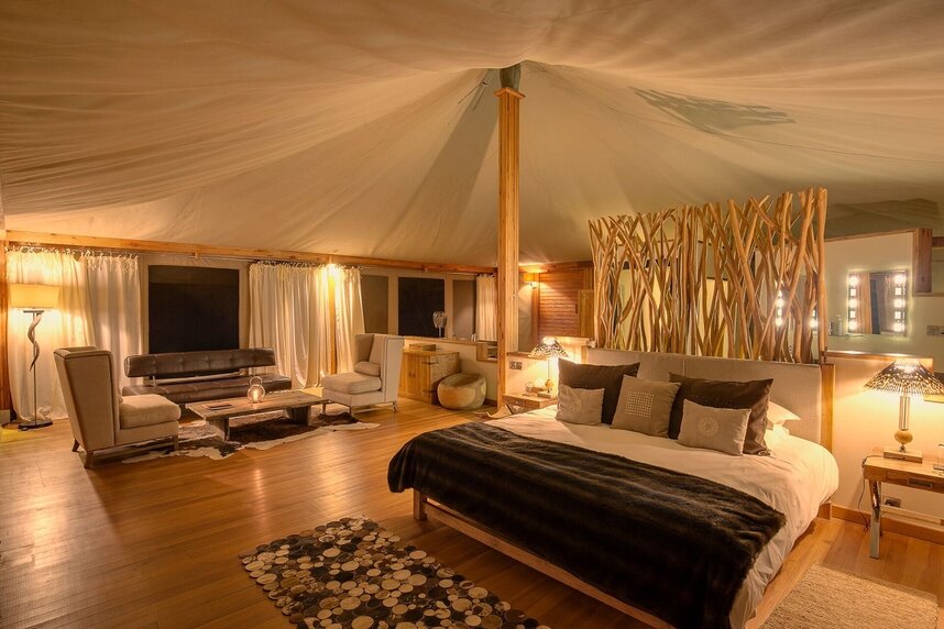 Die noch intakte Farm wurde 2016 mit 12 eleganten und geräumigen Zelt-Suiten (49 m²) wiedereröffnet. Sie verfügen über ein geräumiges Bad sowie eine Veranda mit Sitzgelegenheiten. Von hier können Sie wunderbar die vorbeiziehenden Tiere beobachten. Außerdem gibt es drei Familieneinheiten, bestehend aus 2 miteinandern verbundenen Zelt-Suiten. Je eine Familienunterkunft und eine Zelt-Suite verfügen zusätzlich über Zugang zu einem Privat-Pool.