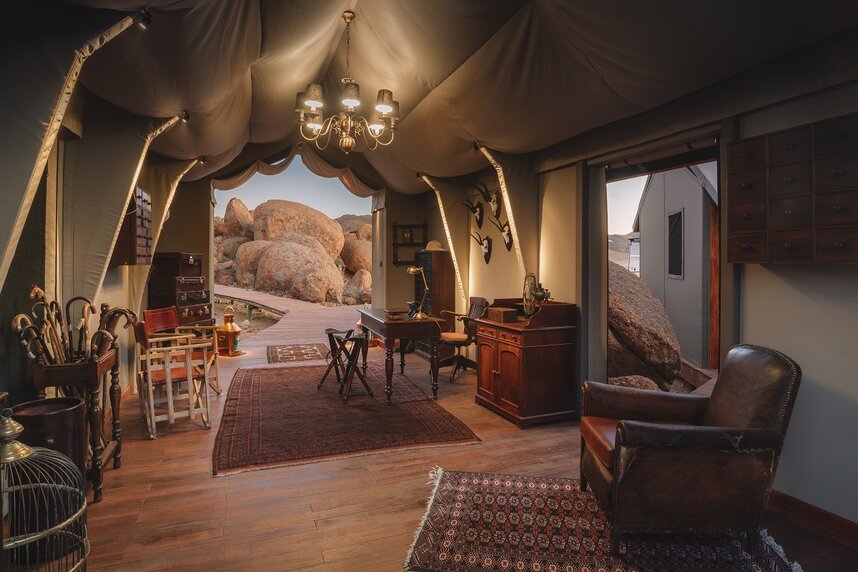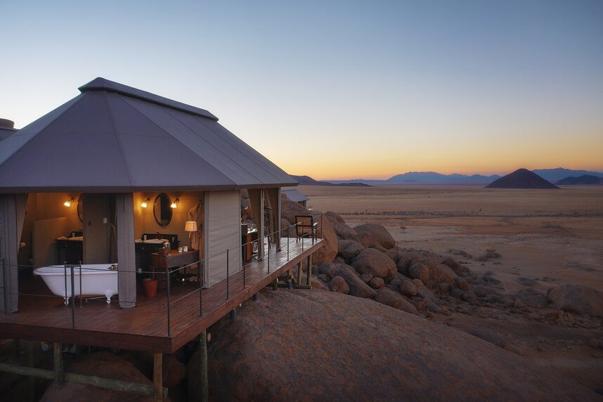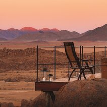 In der Namib Wüste, am südlichen Zipfel Namibias, befindet sich die Sonop Lodge - ein luxuriöses Zeltcamp in der Region Hardap. Die Lodge wurde im Stil der Eroberer des frühen 20. Jahrhunderts gestaltet und erinnert an ein Wüstencamp der Kolonialzeit. Kein Ort eignet sich besser, um sich von der wahren Schönheit der Wüste betören zu lassen. Auf Pirschfahrten können Sie Oryxantilopen, braune Hyänen, Kaninchen, Füchse, Schakale, Kudus und Leoparden entdecken. Die Wüste erleben Sie hautnah bei Wanderungen bei Tag und Nacht oder bei einem Dinnerabend in den Dünen. Neben diesem puren Wüstenerlebnis wird Ihnen ein unvergesslicher Komfort geboten. Sie logieren in geräumigen Luxuszelten, kühlen sich bei Bedarf im Infinity-Pool ab und genießen jeden Abend opulente gastronomische Erlebnisse. Lassen Sie sich von der Ruhe, der endlosen Weite und dem funkelnden Sternenhimmel in den Bann ziehen. Die Cocktail- und Zigarrenlounge mit ihrer warmen Atmosphäre erinnert an die Pracht kolonialer Innenräume. Für die ultimative Entspannung bietet das Zannier Hotel Sonop auch einen Spa und ein Fitnesscenter, beide mit Blick auf die Wüste.
