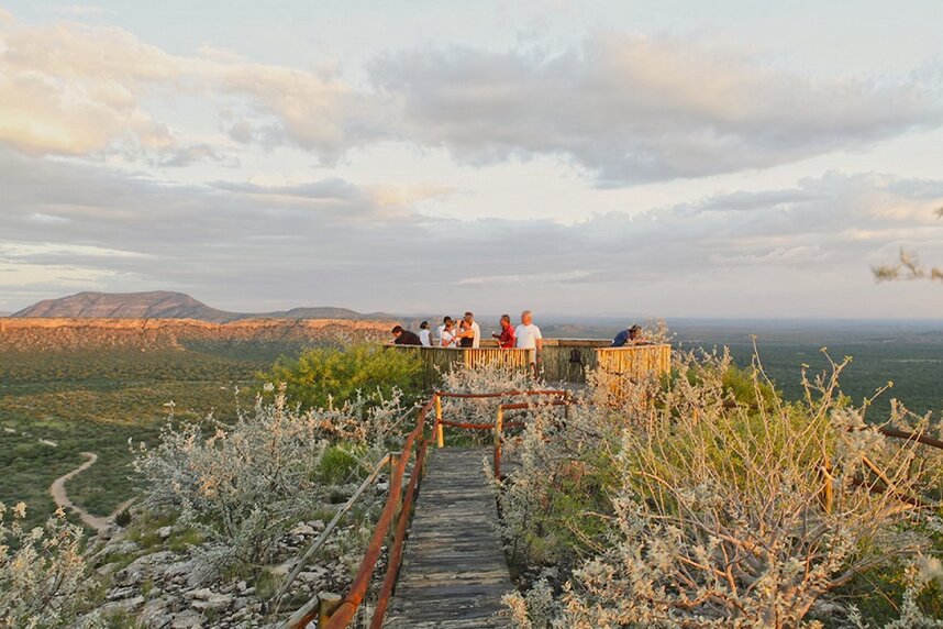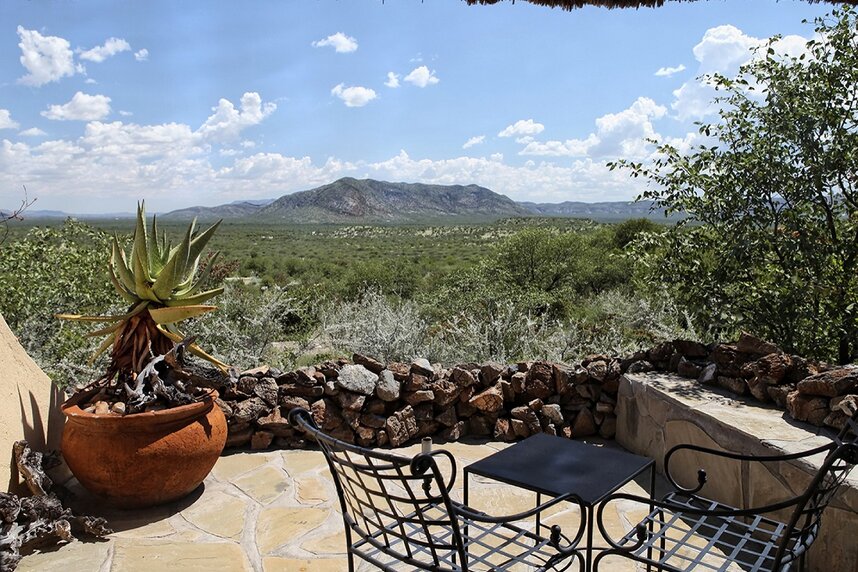 Die Lodge liegt in der atemberaubenden Landschaft des Ugab Valley und in der Nähe des bekannten Vingerklip (Fingerklippe), einer 35 Meter hohen Steinformation. Die Unterkunft ist im afrikanischen Stil eingerichtet. Von den Terrassen der 23 Bungalows und den zwei Swimmingpools haben Sie besten Blick über das Tal mit den zerklüfteten Felsen. Die Lodge verfügt neben dem Hauptrestaurant über das "Eagles Nest", ein kreisrundes Panoramarestaurant direkt auf dem Plateau, welches neben einem spekatulären Ausblick exquiste afrikanische Gerichte offeriert. Die Bar lädt zu erfrischenden Drinks mit herrlichem Weitblick in die Savanne ein. WLAN ist in der Lobby verfügbar. Drei Wasserlöcher auf dem Areal der Lodge locken Wildtiere wie Giraffen, Antilopen oder Zebras, die Sie aus sicherer Entfernung beobachten können. Das größte Wasserloch ist auch nachts beleuchtet.