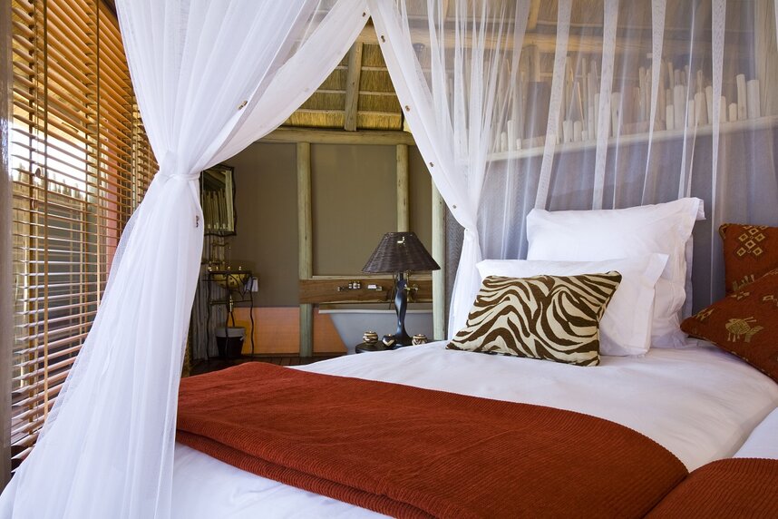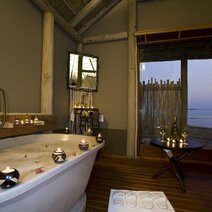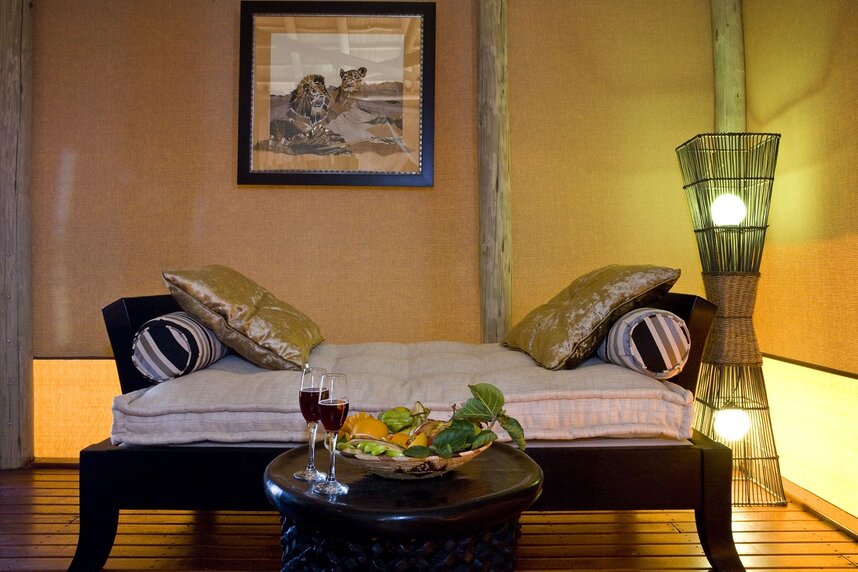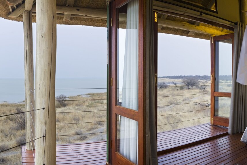 Die 15 Chalets haben Reetdächer und Canvaswände und sind auf erhöhten Plattformen gebaut, die einen weiten Ausblick auf die Pfanne gewähren. Sie sind alle komfortabel mit Dusche, Badewanne, Außendusche und eigener Veranda ausgestattet.