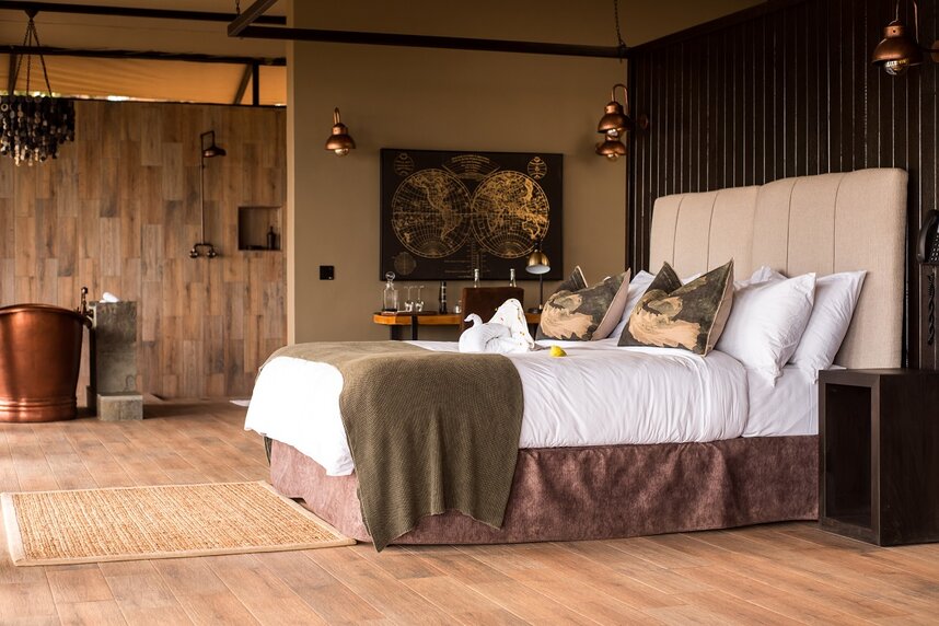 Die 10 luxuriösen und hellen Zelt-Suiten stehen auf hölzernen Plattformen und haben alle eine große Veranda und Feuerstelle. 2 Family Suiten sind mit privatem Plunge Pool ausgestattet. Das en-suite Badezimmer wartet mit Badewanne und 2 Indoor-Duschen auf.
