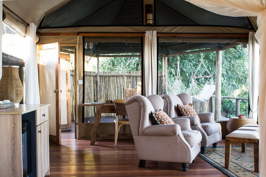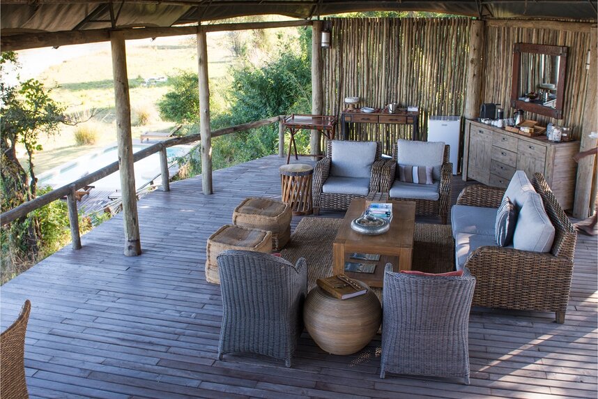 Das Camp verfügt über nur 4 traditionelle Safarizelte, alle mit en-suite Badezimmer, einer geräumigen Sitzecke und einem privaten Außendeck mit Blick auf den Ngwenya Channel. Hölzerne Laufwege verbinden den Hauptbereich mit den einzelnen Safarizelten.