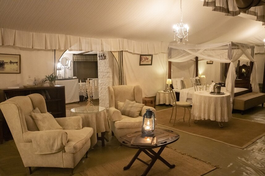 Zum Camp gehören 5 Doppel Zelt-Suiten, 2 Honeymoon-Tents, sowie auch 4 Familienzelte. Alle Zelte verfügen über ein privates Bad, die Familienzelte verfügen über ein separates Wohnzimmer mit Kamin.