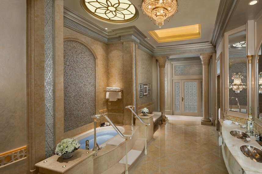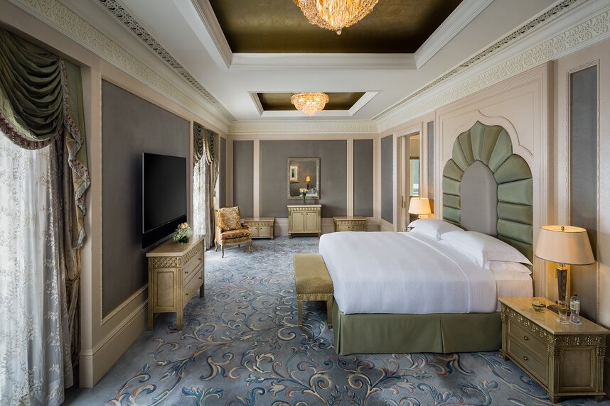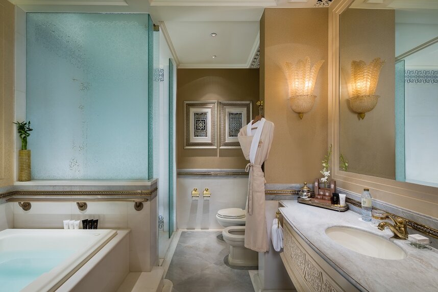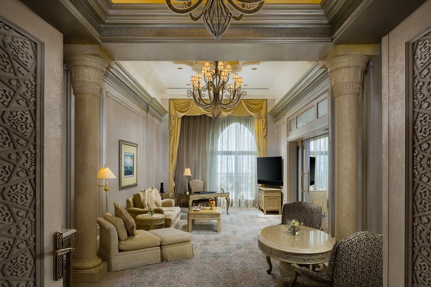 302 Zimmer und 92 Suiten vereinen zeitgemäßen Komfort mit arabischem Design. Je nach Lage der Zimmer (alle 55 m²) wird zwischen den Zimmerkategorien Coral (Gartenblick), Pearl (teilweise Meerblick) und Diamond (direkter Meerblick) unterschieden. Die Suiten (110-680 m²) sind ein Highlight für sich und definieren Luxus und Exklusivität pur. Krönender Höhepunkt sind hier die Palace Suiten mit einem bis drei Schlafzimmern. Sie verfügen unter anderem über einen eigenen Eingangsbereich, einen Jacuzzi im Badezimmer, Zutritt zur exklusiven Palace Lounge sowie begehbare Kleiderschränke für Sie und Ihn. Ein ohne jeden Zweifel königliches Erlebnis.