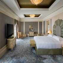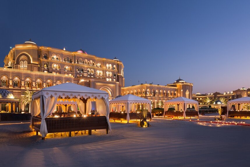 Der legendäre Emirates Palace setzt mit unvorstellbarem Luxus bis ins kleinste Detail höchste Maßstäbe. Das Anwesen mit seinen 114 vergoldeten Kuppeln liegt an einem ca. 1,3 km langen Privatstrand direkt am äußeren Ende der Corniche. Die weitläufige Gartenanlage bietet an zwei Pool-Landschaften mit Poolbar und Jacuzzis viel Platz zum Verweilen. Am Westflügel befindet sich ein Abenteuerpool mit Wasserrutschen und Wasserfällen. Eine Vielzahl an Anwendungen genießen Sie im exklusiven Spa. Aktiven Gästen werden ein umfangreiches Sportprogramm sowie zwei Fitnesscenter mit modernster Ausstattung geboten. In 14 Restaurants und Bars verwöhnen Sie die Küchenchefs mit vielfältigen, kulinarischen Highlights. Wie wäre es zum Beispiel mit moderner, asiatischer Küche im "Hakkasan", Grillspezialitäten direkt am Strand im "BBQ Al Qasr", italienischen Leckerbissen im "Mezzaluna" oder einheimischer Gourmetküche im "Mezlai"? Der "Havana Club" ist zurecht stolz darauf, mit seiner Auswahl an feinsten Cognac-, Armagnac- und Zigarrensorten selbst die anspruchsvollsten Kenner zu begeistern.