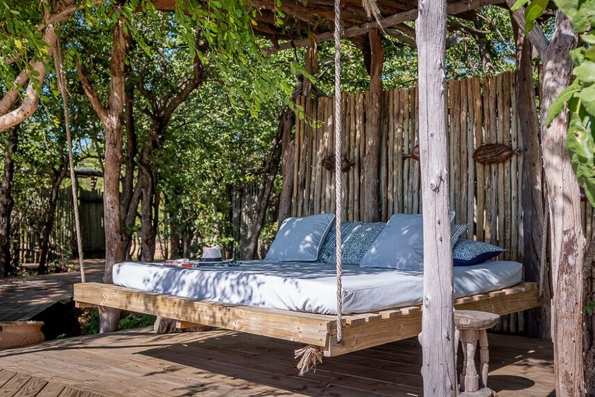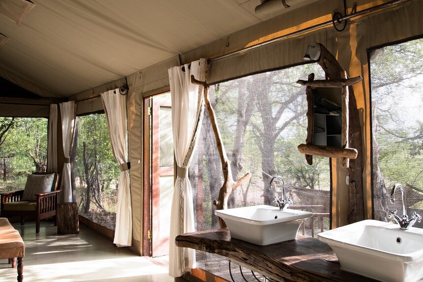 Im Schatten von Mopane Wäldern liegen acht geräumige Zeltsuiten im afrikanischen Stil mit en-suite Bad und Hängematte auf der Veranda. Jedes Zelt hat seinen eigenen, individuellen Charme und ist sehr offen und groß gestaltet.