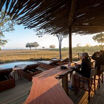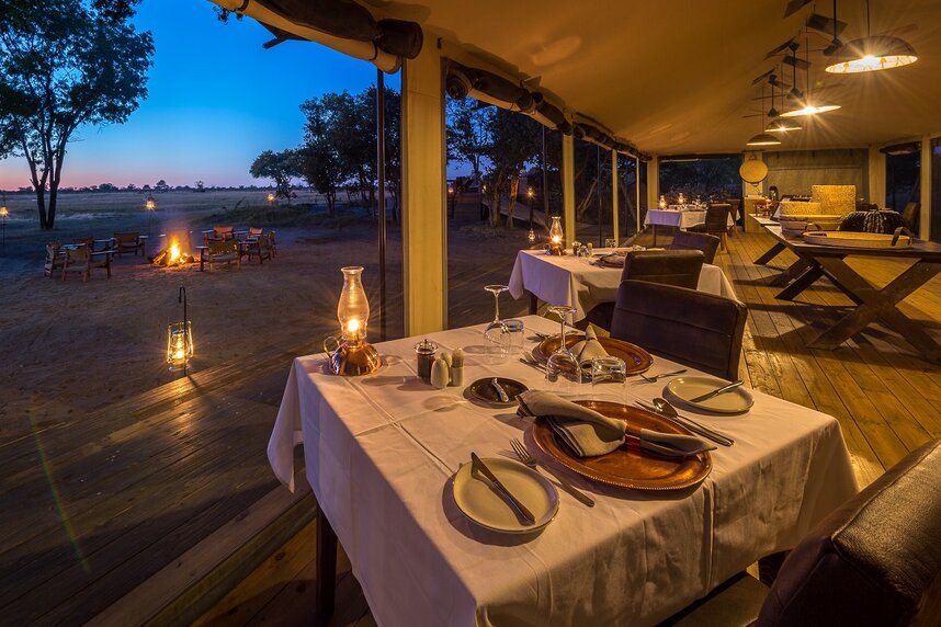 Das Camp bietet sechs komfortable Luxuszelte - darunter eine Familieneinheit - mit Innen- und Außendusche. Die Zelte sind durch Teakholzstege mit dem Hauptbereich verbunden.