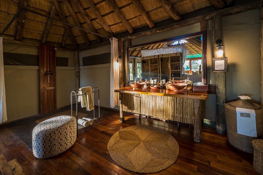 Das Camp bietet sieben luxuriöse Zelte, darunter ein Familienzelt. Diese verfügen über ein en-suite Bad mit Dusche und zwei kupfernen Waschbecken, sowie einen Safe und eine große Veranda auf erhöhten Holzplattformen direkt am Fluss.
