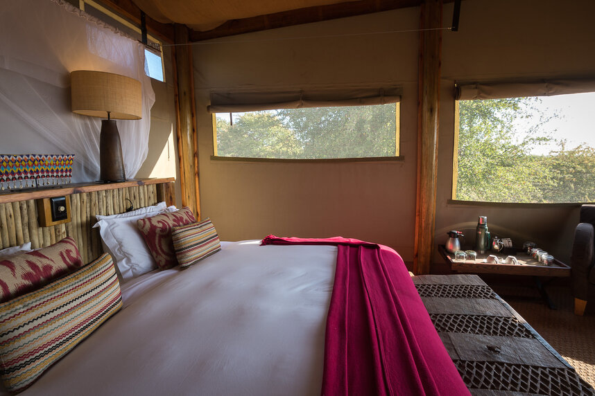 Das Camp verfügt über acht Safari-Zelte, darunter ein Familienzelt mit en-suite Bad. Sie alle befinden sich auf Plattformen mit kleiner Veranda. Über jedem Zelt ist ein stabiles Sternendeck gebaut, von wo aus man einen wunderbaren Blick über die Wüste hat, und auf dem man auf Wunsch schlafen kann.