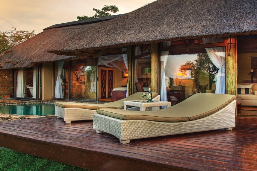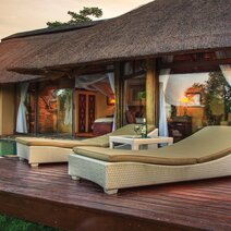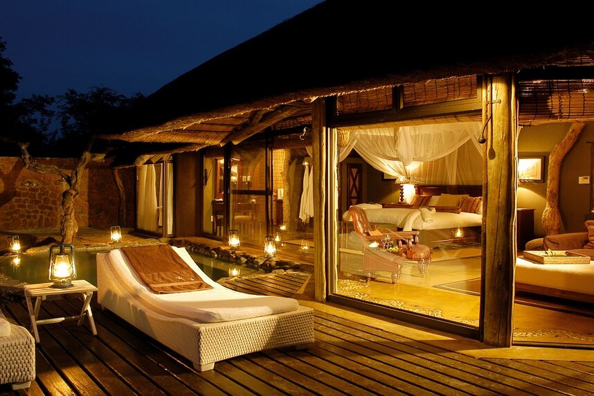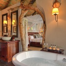 Die acht Suiten sind geschmackvoll und exklusiv ausgestattet und verfügen über ein Bad mit Innenund Außendusche sowie einer Badewanne, eine Klimaanlage, eine Minibar, eine Veranda und einen kleinen, privaten Felsenpool. Eine große Glasfront bietet einen herrlichen Blick in die Wildnis. Genießen Sie die Privatsphäre Ihrer Suite und lassen Sie sich von der zeitlosen Faszination Afrikas verzaubern.