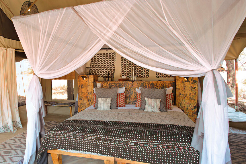 Das Camp besteht aus sieben rustikalen Zelten mit WC und Buschdusche. Sie sind gemütlich und rustikal, mit ökologischer Spültoilette und Buschdusche eingerichtet und verfügen über eine kleine Terrasse, von der Sie die atemberaubende Wildnis beobachten können.