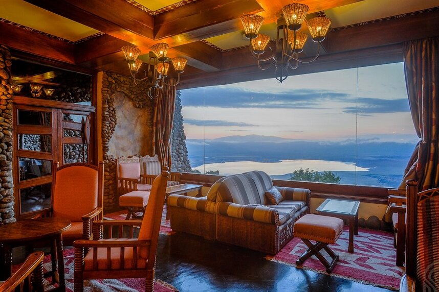 Das lange, aus Natursteinen erbaute und mit Efeu bewachsene Gebäude schmiegt sich an den südlichen Kraterrand und verschmilzt harmonisch mit der Landschaft des Ngorongoro Kraters. Täglich finden Pirschfahrten in den circa 600m tiefer liegenden Grund des Kraters statt. Die satte Vegetation des UNESCO Weltnaturerbes ist eine herrliche Mischung aus Regenwald, Grasflächen und Seen. Das Restaurant auf mehreren Ebenen bietet große Panoramafenster und eine fantastische Aussicht. Im Inneren der ebenfalls aus Flussstein gebauten Bar brennt zu jeder Zeit ein Feuer und die Wände der luxuriösen Lodge sind mit Felsmalereien dekoriert.