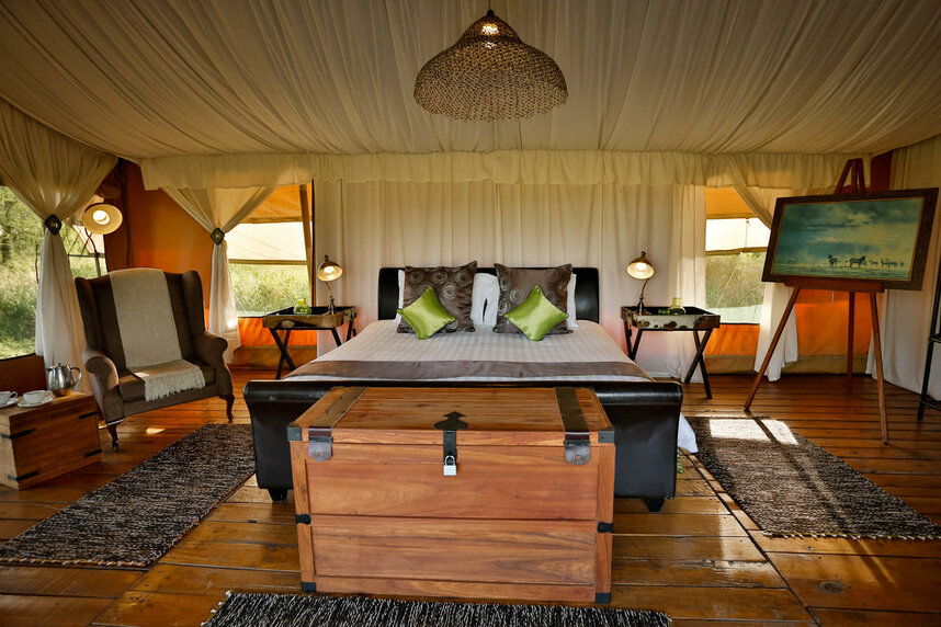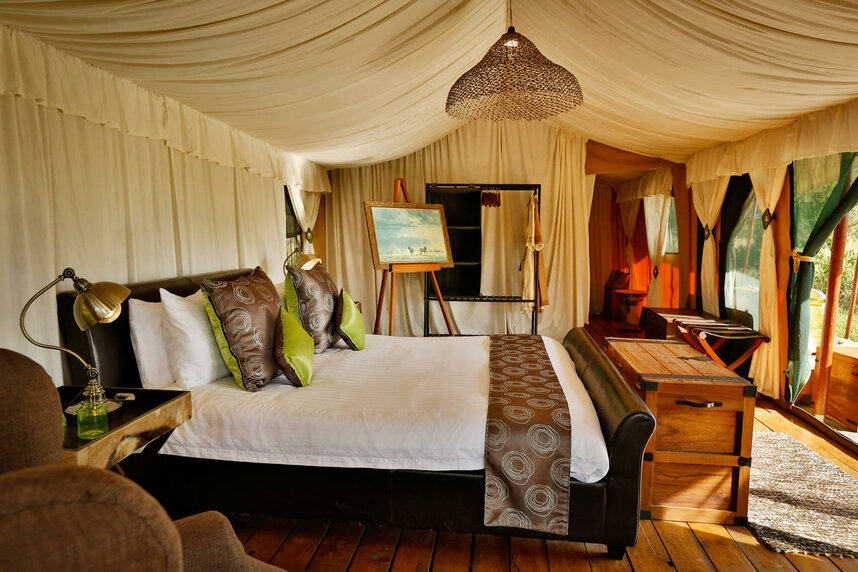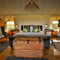 Die zwölf ebenerdigen Zelte, darunter eines für Familien, sind geräumig und verfügen über en-suite Badezelt mit Spültoilette und Bucket- Shower, die von Ihrem Butler nach Wunsch mit heißem Wasser befüllt wird.