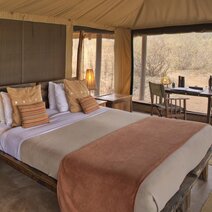 Das Hauptcamp verfügt über 10 Safarizelte auf Holzplattformen mit großer Innen- und Außendusche. In den gemütlich eingerichteten Zelten mit WC und fließend warmem Wasser können die Gäste entspannen und die Eindrücke des Tages auf sich wirken lassen.