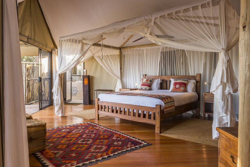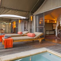 Zum Camp gehören zwölf äußerst geräumige und elegant gestaltete Zelte, die mit einigem Abstand entlang des Flusses errichtet wurden. Sie liegen leicht erhöht auf hölzernen Plattformen und verfügen über Innen- und Außendusche und eine gemütliche Sitzecke. Große Glastüren öffnen sich zum prviaten Aussichtsdeck mit eigenem Pool. Besonders geeignet für Familien ist die Family Suite mit zwei Zimmern, welche über ein Deck verbunden sind.