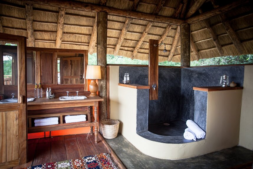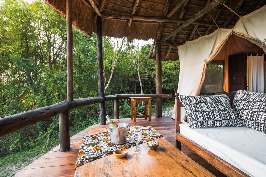 Acht luxuriöse Zeltsuiten im klassischen Safaristil sind mit Holzböden und großzügigen Bädern ausgestattet. Von der Veranda eröffnet sich ein beeindruckender Ausblick in die Natur.