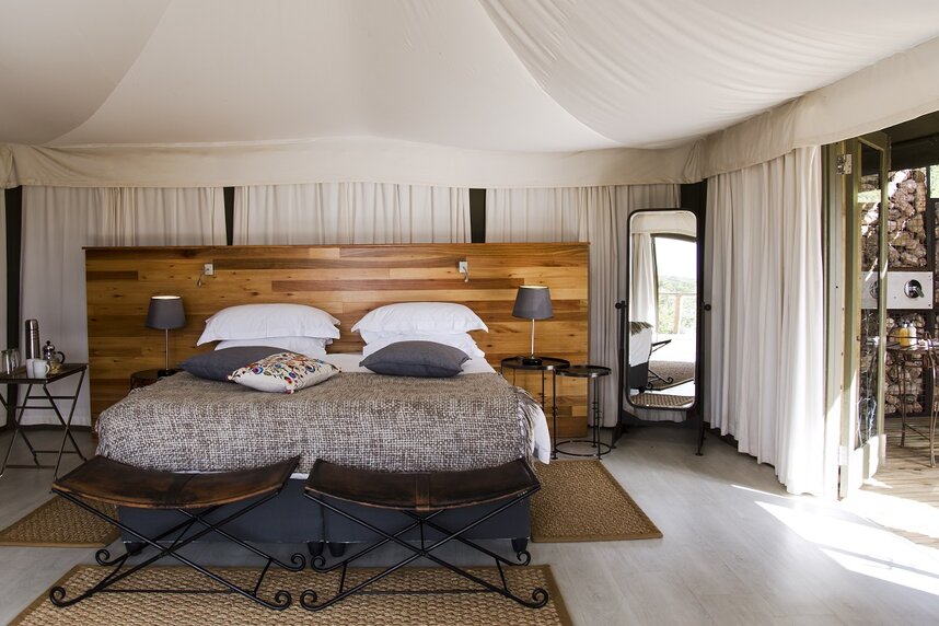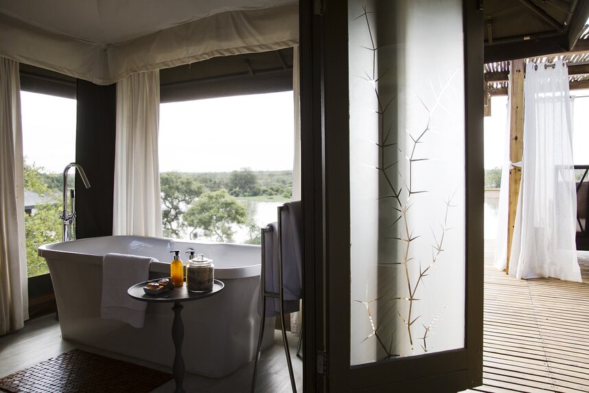 Die 8 luxuriösen Zeltchalets bieten alle ein privates Deck mit Blick auf die Weiten des afrikanischen Busches. Sie sind ausgestattet mit en-suite Badezimmer mit Innen- und Außendusche, Plunge-Pool, Klimaanlage, Minibar, Tee und Kaffeezubereiter, Safe, Föhn und elektrischen Wärmedecken für die kühleren Winternächte.