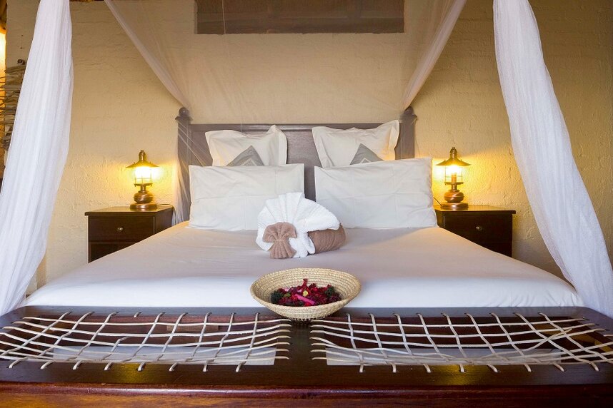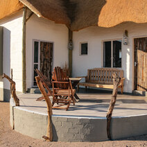 Die 28 rustikalen und reetgedeckten Stein-Chalets verfügen über eine Tee-/ Kaffeestation, en-suite Badezimmer, Klimaanlage, eine gemütliche Veranda mit Sitzmöbeln und weitläufigen Ausblick auf die Graslandschaft sowie die Bergketten im Hintergrund.