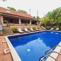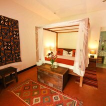 Das ehemalige koloniale Anwesen ist von einem schönen tropischen Garten umgeben. Die insgesamt 16 Zimmer sind im Garten verteilt und mit europäischen und afrikanischen Elementen gestaltet. Zur Ausstattung gehören ein Doppelbett oder zwei Kingsize-Betten mit Moskitonetzen, ein Safe, Ventilator, ein Schreibtisch, eine kleiner Veranda so wie ein Badezimmer mit Dusche. Größere Zimmer für Familien sind ebenso vorhanden. WLAN steht den Gästen in den Zimmer und im Hauptbereich zur Verfügung sowie eine kleine Bibliothek und ein Business Center. Entspannen Sie nach dem langen Flug oder vor der Heimreise am Swimmingpool. Sonnenliegen stehen unter schattenspendenden Bäumen bereit. Persönlichen Service bietet das freundliche Personal vom The Boma Guesthouse in der Lounge, an der Bar oder der Frühstücksterrasse mit Restaurant. Dort werden hausgemacht Gerichte serviert.