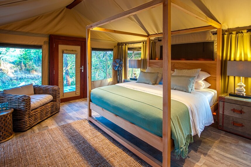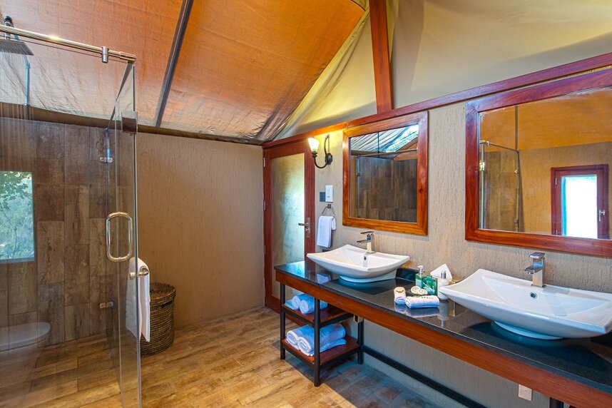 Das elegante Camp bietet 6 geräumige Safari-Zelte mit Deckenventilator, Moskitonetz über dem Bett und großer, umlaufender Veranda. Die Einrichtung ist in einem modernen und wohnlichen Design gestaltet und verfügt über ein riesiges Badezimmer mit einer großen Dusche.