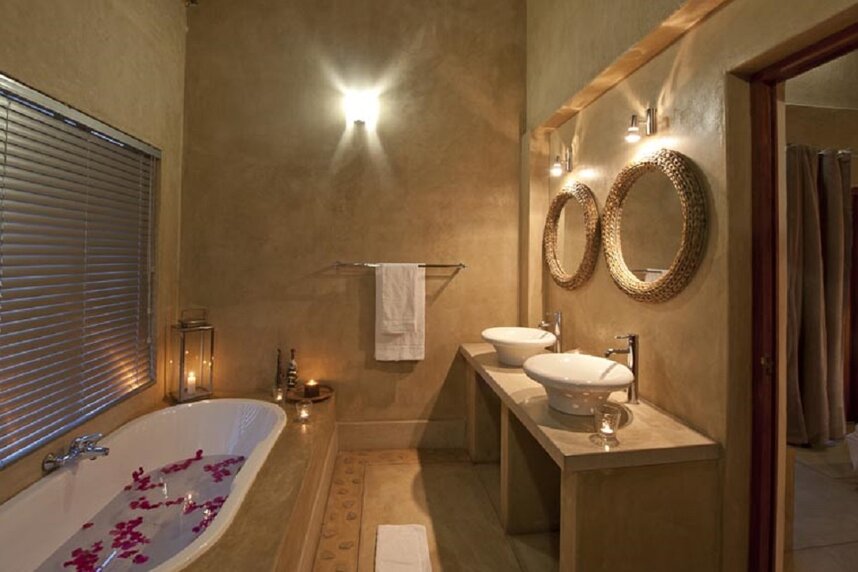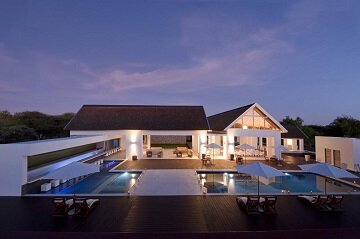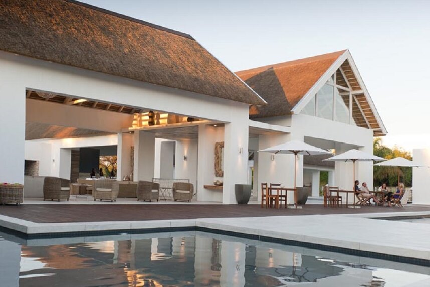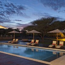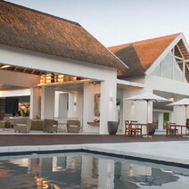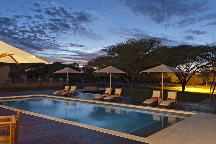 Die luxuriöse, privat geführte Emanya@Etosha Game Lodge befindet sich ca. 20 Minuten vom Osteingang des Etosha Nationalparks entfernt. Das Hauptgebäude mit zwei großzügigen Pools, erstklassigem Restaurant und Weinkeller besticht durch seine exklusive Architektur, in der weiße Eleganz dominiert - hier bleibt der Busch vor der Tür. Die hellen Holzmöbel und Korbsessel in Naturtönen ergänzen sich optimal und runden die Einrichtung mit einer Mischung aus modernem und afrikanischen Design ab. Eine sehr lange Poolbar, an der man seine Füße bei einem Drink im Poolwasser taumeln lassen kann, lädt zur Entspannung ein. Die doppelstöckige Aussichtsterrasse bietet den idealen Sundowner-Spot mit Blick auf zahlreiche Tiere die sich an der Wasserstelle regelmässig aufhalten.